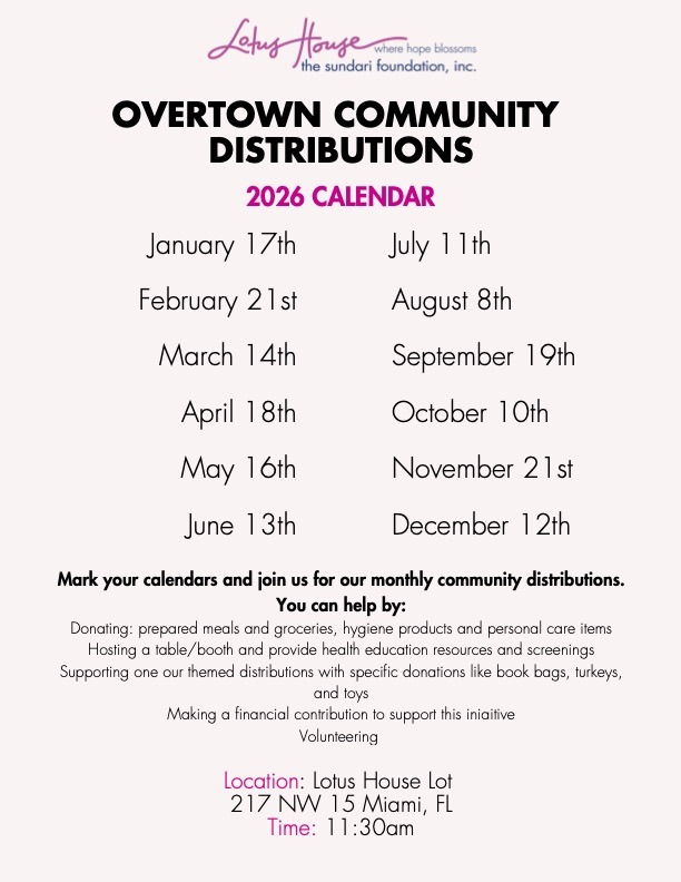 In an effort to make a larger impact on our neighbors, Lotus House launched an annual Health and Wellness and Back to School Fair taking place every August in front of our facility since 2018. As a result of the pandemic and the growing need of resources, we started hosting regular events that bring life changing food, hygiene and medical resources and education directly to the community of Overtown, helping to bridge the gap and overcome obstacles. Now hosted monthly, these events will feature the following throughout the year:
